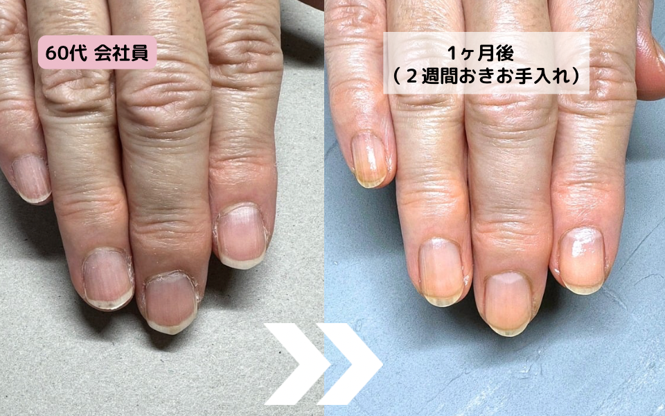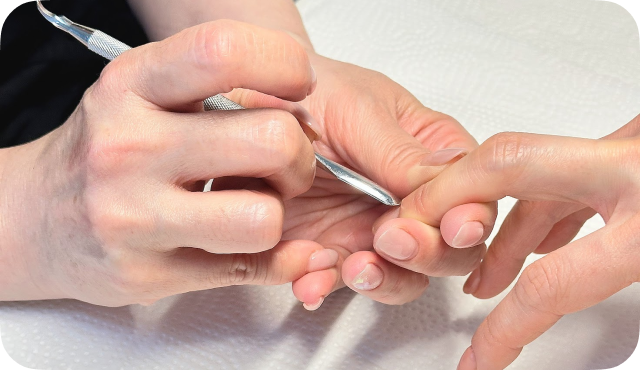 A. 爪表面の処理だけでなく薄い膜のような角質や甘皮を除去します。またネイル専用器具を使ってのケアをすることにより血行が促進されます。そのため爪が健やかに育ちやすくなります。一本一本丁寧にケアをしていきます。