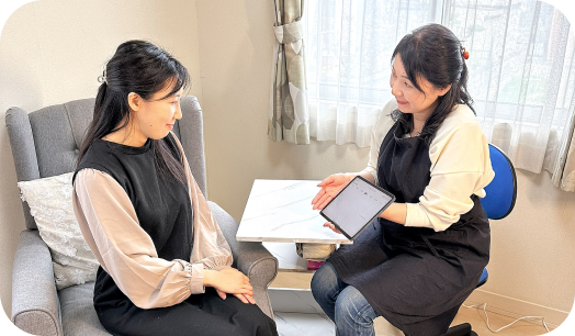 当店では初回一度だけのネイル施術だけでなくお客様と一緒に爪の改善に向けて取組むためにアフターフォローを徹底しています。ホームケアの仕方、手の所作のアドバイスやお手入れ来店周期のご提案などお客様一人一人に合ったケアをしていきます。